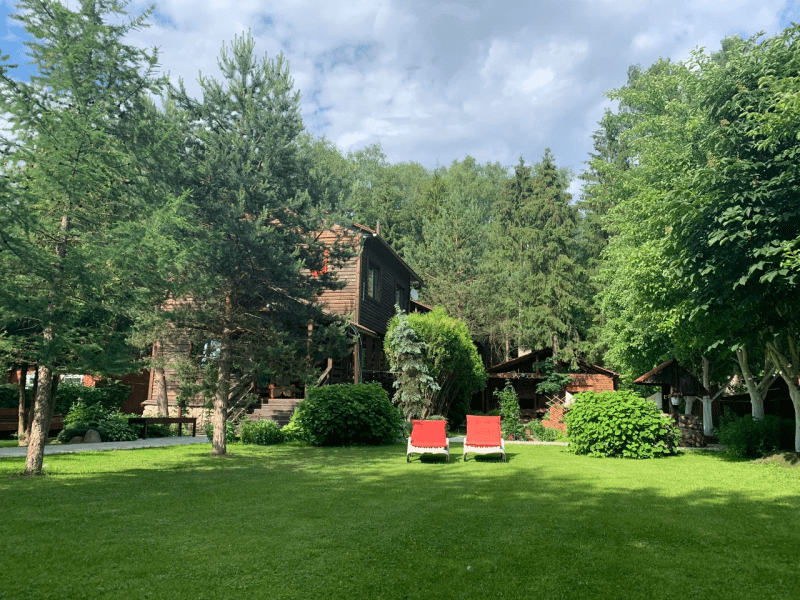 Самолетом до аэропорта Внуково (г. Москва), далее на рейсовом автобусе №486 до остановки «39-й километр Минское шоссе», далее на рейсовом автобусе №457 до остановки «Дорохово», далее пройти 1,4 км до гостевого дома.